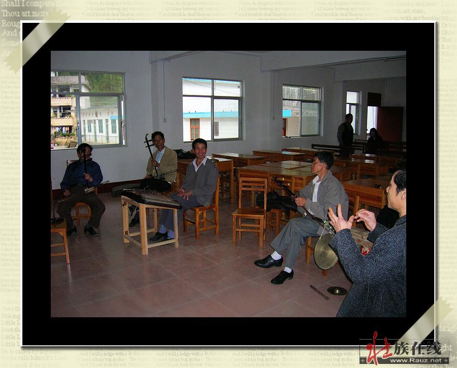 蓝蚂蚁~~你好,我是僚人家园的新会员~~你在贴子上说:“他们每天晚上都在你家楼上演奏”是真的吗?我是师大的一名学生,我目前在研究一个有关广西壮剧的课题~~因为现在广西的戏曲正在慢慢的被流失,我想作一个关于怎样保护并发扬我们壮族戏曲文化的论文~~但由于本人缺少充分的资料~目前还没能完成~~希望僚人家园的朋友,喜欢壮剧的朋友给与本人帮助~~提供点有关壮剧的资料~~因为本人也是壮族,我不希望本民族的文化慢慢的被遗忘流失、、、、、