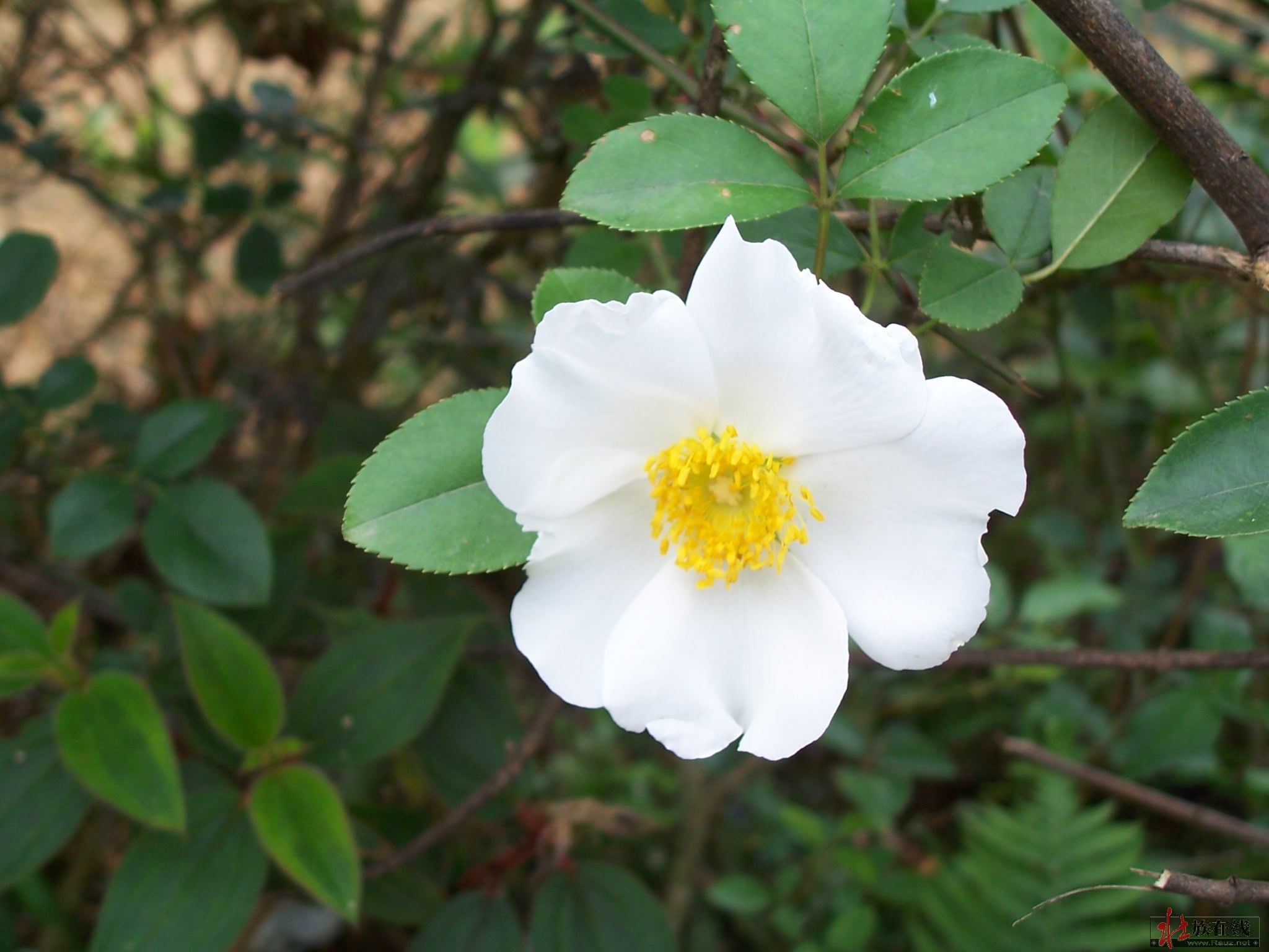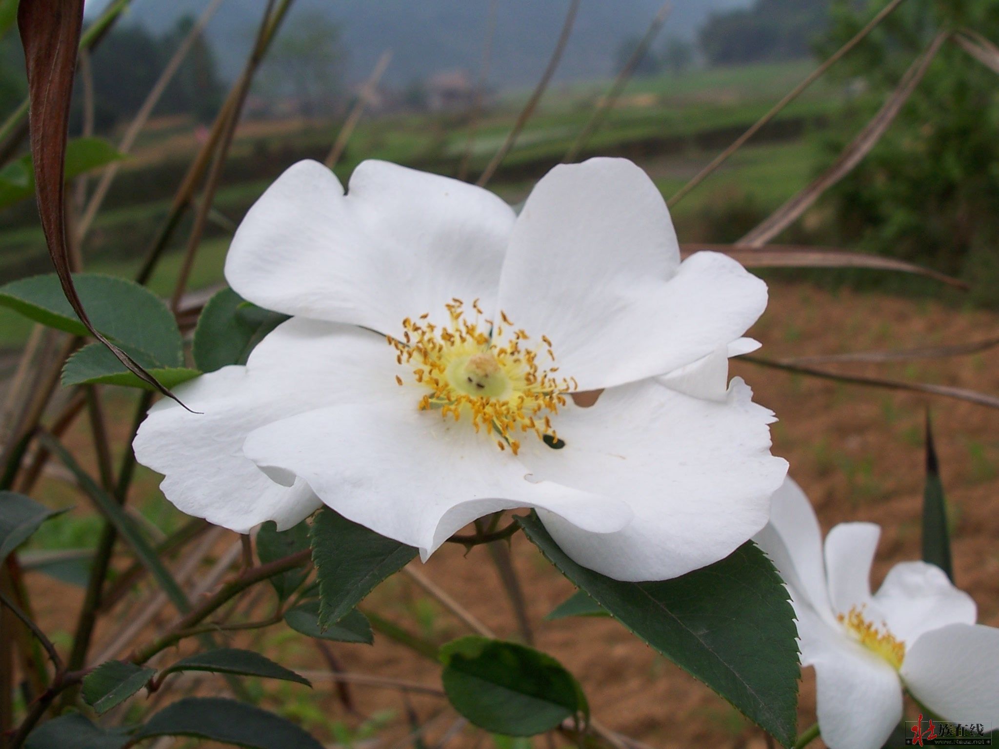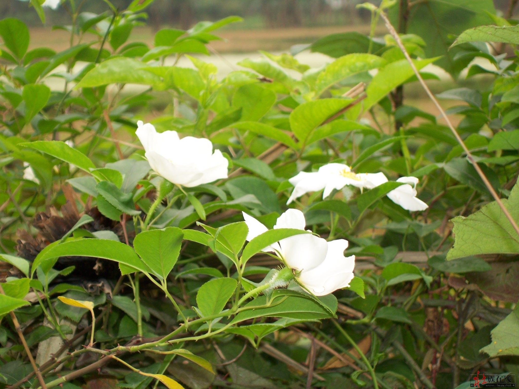 常绿攀援灌木,高可达5米:小枝粗壮,散生扁弯皮刺,无毛,幼时被腺毛,老时逐渐脱落减少。小叶革质,通常3,稀5,连叶柄长5—10厘米;小叶片椭圆状卵形、倒卵形或掖针状卵形,长2—6厘米,宽1.2—3.3厘米,先端急尖或圆钝,稀尾状渐尖,边缘有锐锯齿,上面亮绿色,无毛,下面黄绿色,幼时沿中肋有腺毛,老时逐渐脱落无毛;小叶柄和叶轴有皮刺和腺毛;托叶离生成基部与叶柄合生,披针形,边缘有细齿,齿尖有腺体,早落。花单生于叶腋,直径 5一7厘米;花梗长1.8—2.5厘米,偶有3厘米者,花梗和萼筒密被腺毛,随果实成长变为针刺;萼片卵状披针形,先端呈叶状,边缘羽状浅裂或全缘,常有刺毛和腺毛,内面密被柔毛,比花瓣稍短;花瓣白色,宽倒卵形,先端微凹;雄蕊多数,心皮多数,花柱离生,有毛,比雄蕊短很多。果梨形、倒卵形,稀近球形,紫褐色,外面密被刺毛,果梗长约3厘米,萼片宿存。花期4—6月,果期7一l1月。