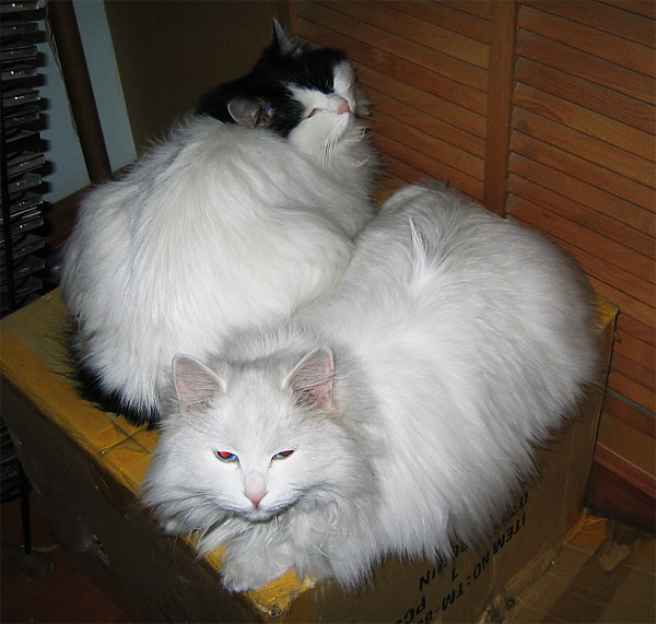 其中小白的血统可能更纯一点,白毛蓝眼睛(照片上因为闪光灯的缘故变成红色),而且具有这个品种常见的特征:耳聋。