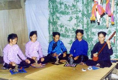 在宁明县记者终于打听到了古巫乐的消息,据一些老干部介绍,在十万大山一带的边境村屯,确实有巫师“跳天”的传统,但这些年已很少发现巫师进行“跳天”表演,现在要找到会表演的巫师一时比较困难。幸运的是凭祥市文化馆的工作人员在边境一带拍下了一组女巫师弹唱天琴的现场表演照片.从照片上看,参加天琴表演的巫师和她的四个徒弟都是老年妇女,巫师拥琴吟唱,四个徒弟则手抖串环伴唱。这显然是一次真正原生态的天琴表演唱,虽然从照片上无法判断她们唱的是什么曲调,但从演唱的方式和乐器、服饰看,演唱来看,天琴表演带有浓郁的壮族巫乐色彩。凭祥市文化馆的同志告诉我们,他们曾以巫师抖串铃跳舞的表演形式创编了一个舞蹈节目,名字叫“舞求舞”,演出后引起了较大的反响。舞求舞突出的是节奏乐器串铃,没有把天琴作为标志道具。