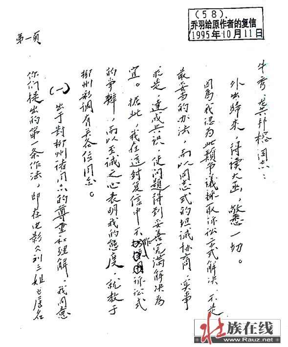 19964月,柳州市副市长徐伟崇,市文联主席柯天国等赴京,通过文化部与乔羽当面协调解决《刘三姐》著作权、署名权问题,乔羽当面表示:《刘三姐》是柳州的,应该还给柳州,并建议由柳州草拟一个协议书电传给乔羽,经签字后执行。除、柯回柳后即时拟了一个“协议书”电传给乔羽,却一直未见回音,市里曾多次电话与文化部、乔羽联系,均无答复。如此拖了一年,当我们再次询问徐副市长和柯天国同志时,他们因乔羽出尔反尔,及拒不与柳州通话……而告诉牛秀、龚邦榕说:既然乔羽不接受调解,我们也无能为力了,你们要告就告吧,于是我们便于1998429日,正式向柳州市中级人民法院上诉,(《诉讼书》)为本文节删本,故从略
