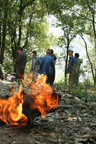 族长带祭,愿山神保勐保板,祭毕,燃放鞭炮,族人至