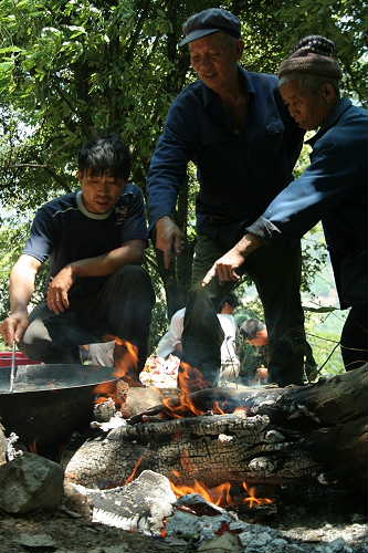 这是一组拍摄于云南省师宗县龙庆乡黑尔村委会甘田村,那是2006年4月10日,正值壮族三月三祭山神的日子(农历三月第一个己日),我和报社的杨大姐、广东大卫独夫以及几位要好的朋友一起前往,拍摄一组族人祭山神的相片,那是第一次触及纪实片,拍摄有头无尾,很不理想!只有加些文字给大家讲述!遗憾的是杨大姐是个女的,不能进入;二一个广东大卫独夫是外人,珍着众族人未到,通过说情了才能进入,等到大部队要来,我们就赶紧撤离,没有拍到大会餐的场面!