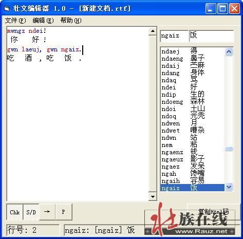 9. 若[chk](拼写检查)是按下状态,在[壮语编辑框]中编辑壮语,可以动态显示彩色单词,用以提示所输单词是否规范。可用来检查是否符合标准壮语的拼写规则,如果是则单词显示彩色,否则单词显示黑色。