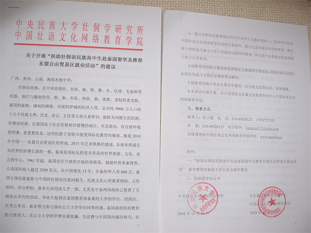 2008年10月,中央民族大学壮侗学研究所与中国壮语文化网络教育学院联合行文,向全国壮侗语民族聚居区中学〈包括广西、贵州、云南、海南〉提出建议:共同开展“扶助壮侗语民族高中生赴泰国留学及推荐东盟自由贸易区就业活动”。