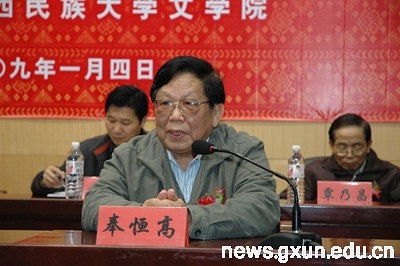 自治区政协原副主席奉恒高代表嘉宾致辞,他说,非物质文化遗产的保护和发展以物质和人才为基础,要以相关的研究机构为平台。广西非物质文化遗产研究中心的正式启动,是广西各民族的大事,是广西深入贯彻十七大精神和科学发展观的具体体现,将有利于促进广西非物质文化遗产的保护和传承事业的发展。