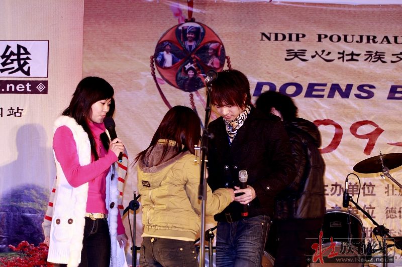 大年初二,罗朗在家乡餐屯参加了村里的晚会并与自己的表妹担当主持,面对村里的贝侬他们全用汉语普通话主持,虽然他唱了两首歌,用的是壮语,但因主持时没用壮语介绍歌曲的相关情况,没读出壮语歌词,受欢迎程度并不太高。而且,用他的话说是“在自己舅舅面前班门弄斧”演唱《Poenyuenz Binghfayz梦火塘》,比较紧张,演出效果他自己不太满意。当晚,北京的黄显光贝侬刚好到达德保,我们从餐屯出发到县城接到黄显光贝侬后已是夜里十二点,但很兴奋,就一起前往餐屯与空灵见面,在空灵家吃了夜宵,一起鼓励罗朗。为方便第二天的排练,在夜宵后将罗朗接到了县城,以便他第二天直接彩排和表演。