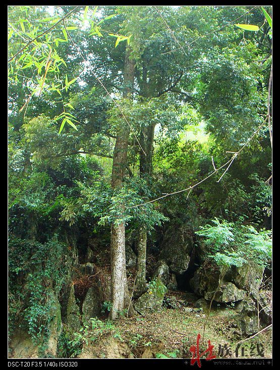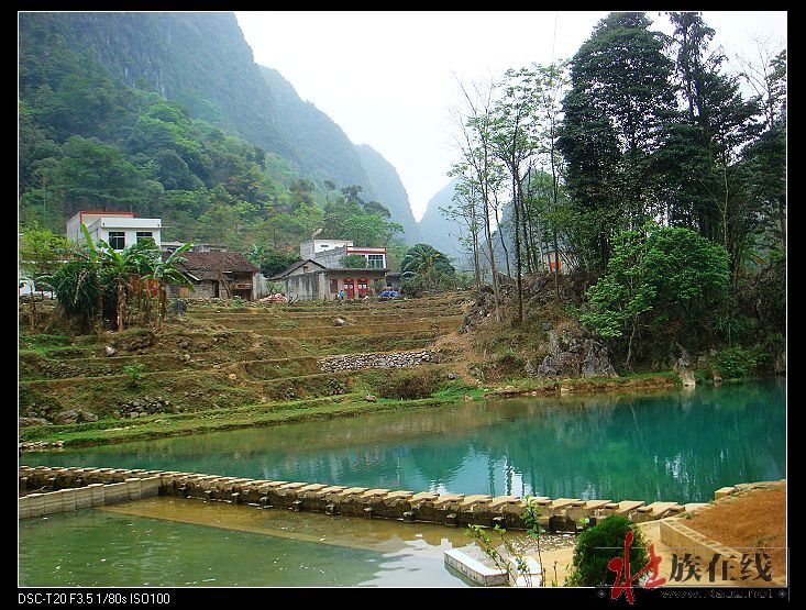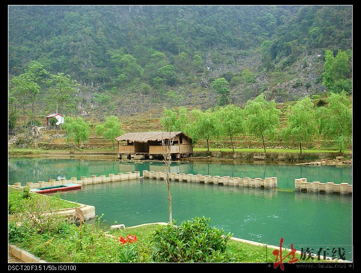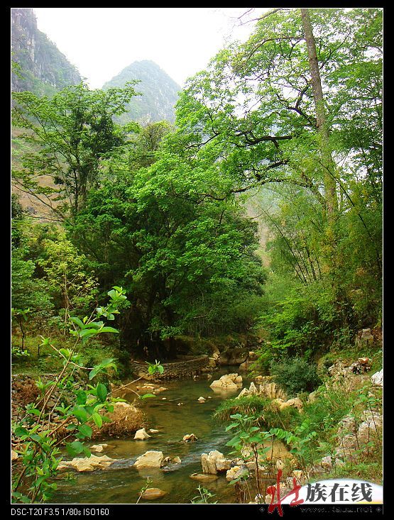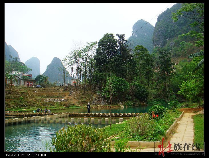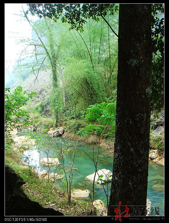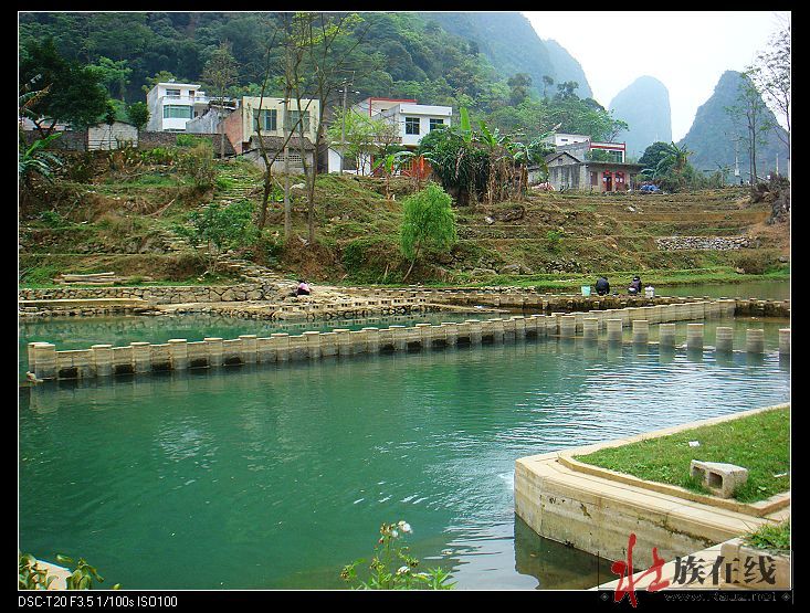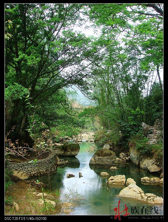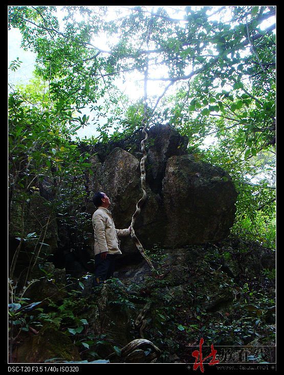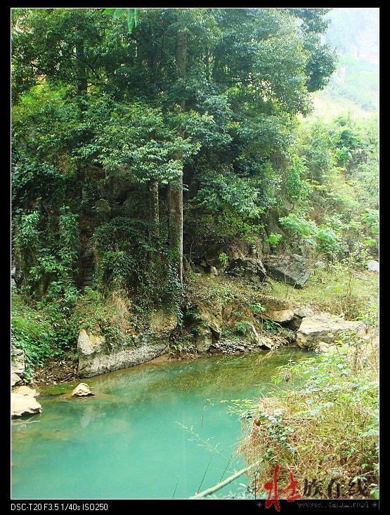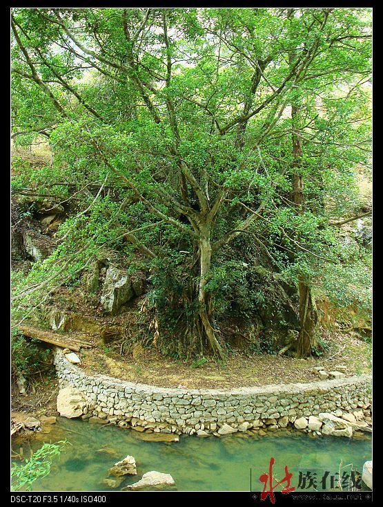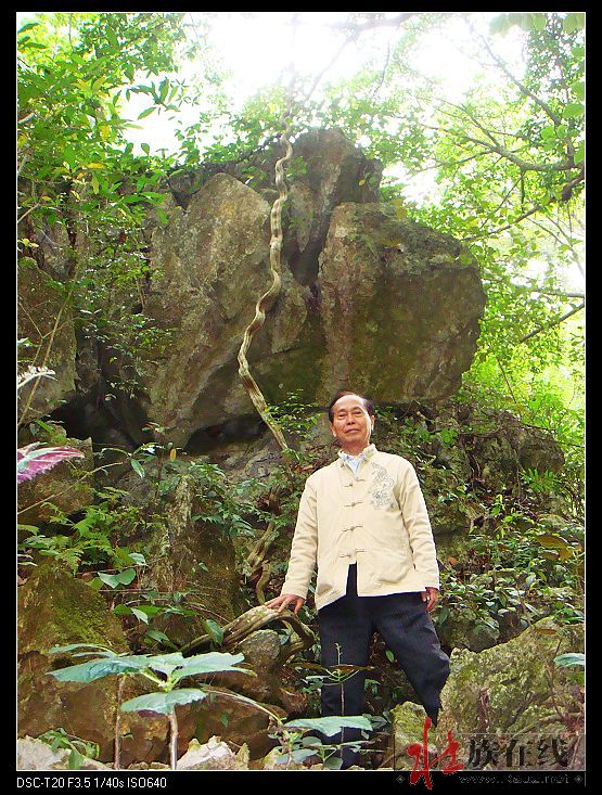 最令我和潘教授激动的是下游的原生态景致区,那里是我们在下游水坝散步后偶然发现的,距离村子这么近的河两边,居然还保留着茂密的树丛河岸,竹林、木棉树、古藤、怪石等,形成十分雅致的自然景观,特别是河岸还有两柱高耸的铁木(mayxhinj),已经是非常珍贵的树种了。河岸两边有简单的土路和石路,这种路正是我们理想当中的原生态旅游景区的样式,还有一个小坝桥,游人可以经过它到达河对岸,虽然现在还是枯水期,水位尚低,但四周的绿意盎然还是令这个河段充满着生机和春色,令人流连忘返。我们在那里游逛了很久才回到服务区吃饭,等差不多离开龙达的时候,许先生才问我们,刚才在那段河岸有没有遇到那条大蛇,我们才知道那里原来还有蛇,而且是一条十几二十公分直径粗、几米长的过山风,这种剧毒而脾气暴烈,随时给人致命危险的蛇,而且是这么的粗长,说出来挺吓人的,但许先生说那条蛇很温顺,他平时去那里散步,遇上它的话,他还会和他打招呼,然后和它byebye告别,总之不要过份靠近它就不会有危险,有点匪夷所思。想起来还有点后怕,因为潘教授在铁木旁的乱石堆上碰到一棵古藤,还在那里逗留了许久,并留影留念了,那蛇大概也是在那里盘踞的吧。有点怀疑那里虽然距离村子近却保持着这么原生态的景观和植物,是不是和那里有大蛇出没有关,德保壮人对大蛇一般都有敬畏之意,认为那不是普通的动物,而是ziox(汉字近音“聚”),多指神蛇或神龙,一般来说那种长着大树又靠近水源、并有乱石堆的地域,都是“ziox”盘踞之地,那种大树也通常叫做mayxziox(汉字近音“梅聚”),不能随意砍伐,否则遭殃,而那种地方普通人也不会靠近,特别不能在那种地方撒尿,否则据说生殖器会肿烂之类。