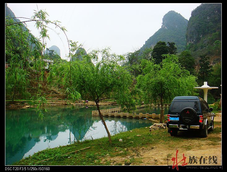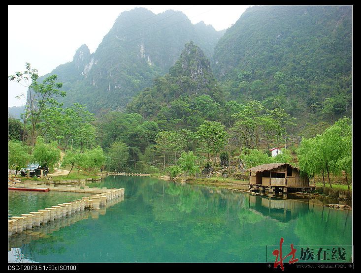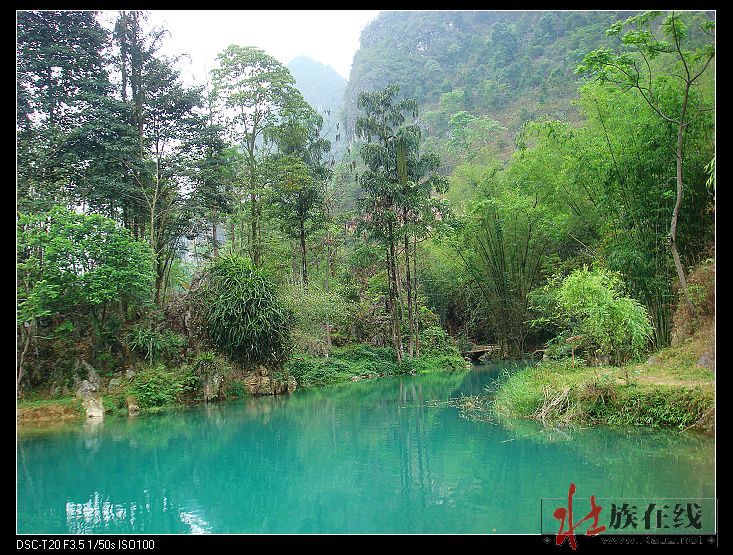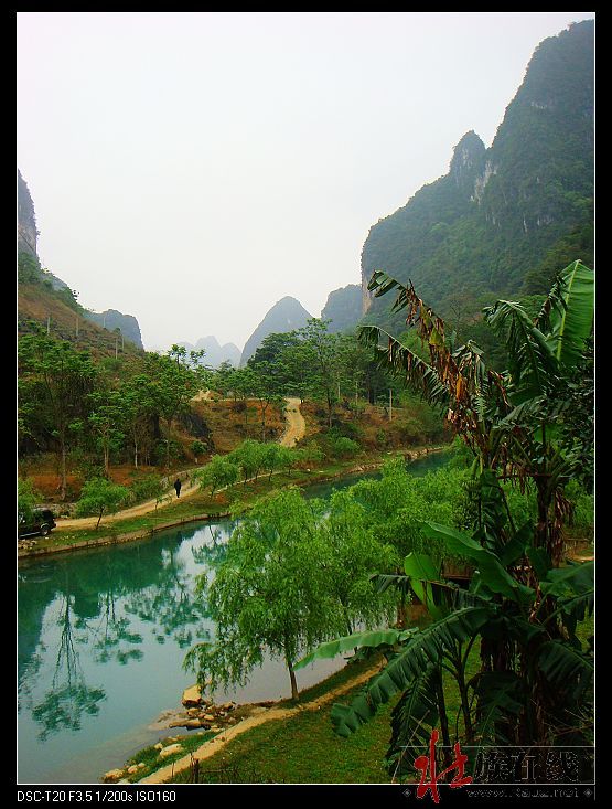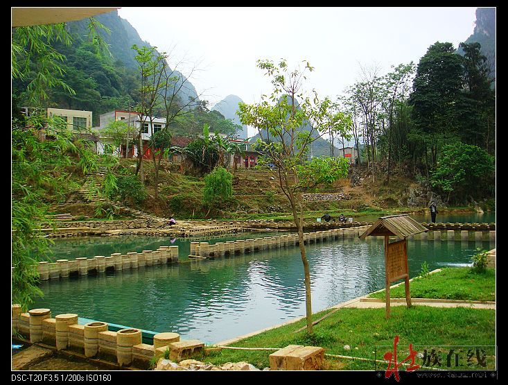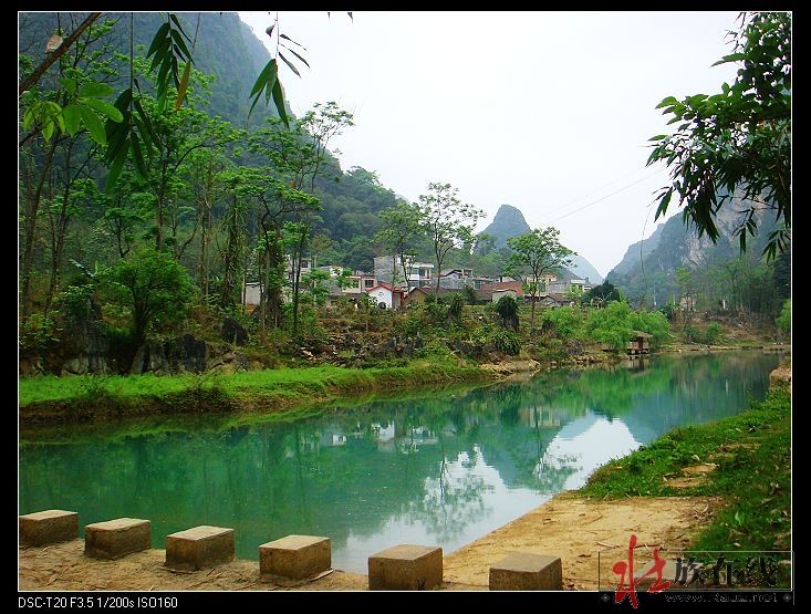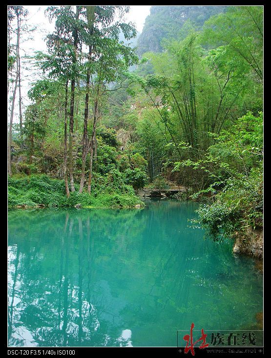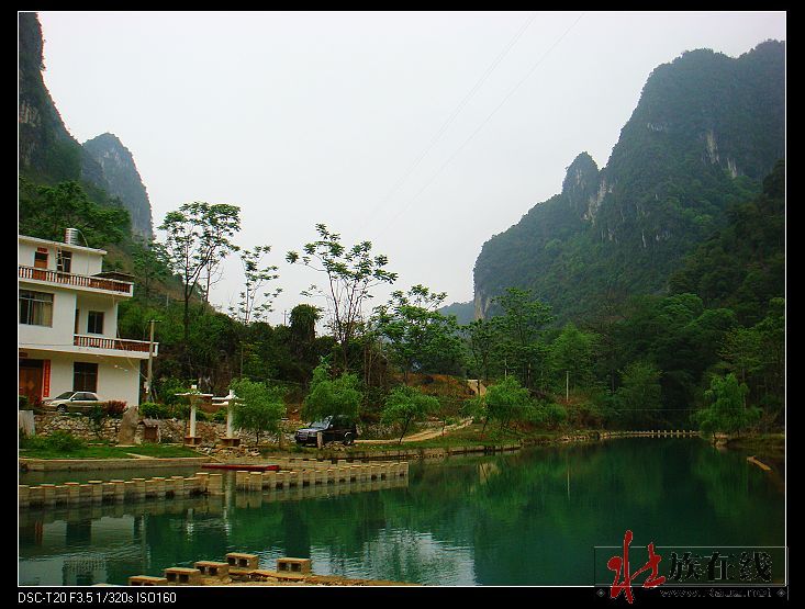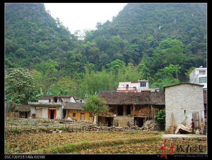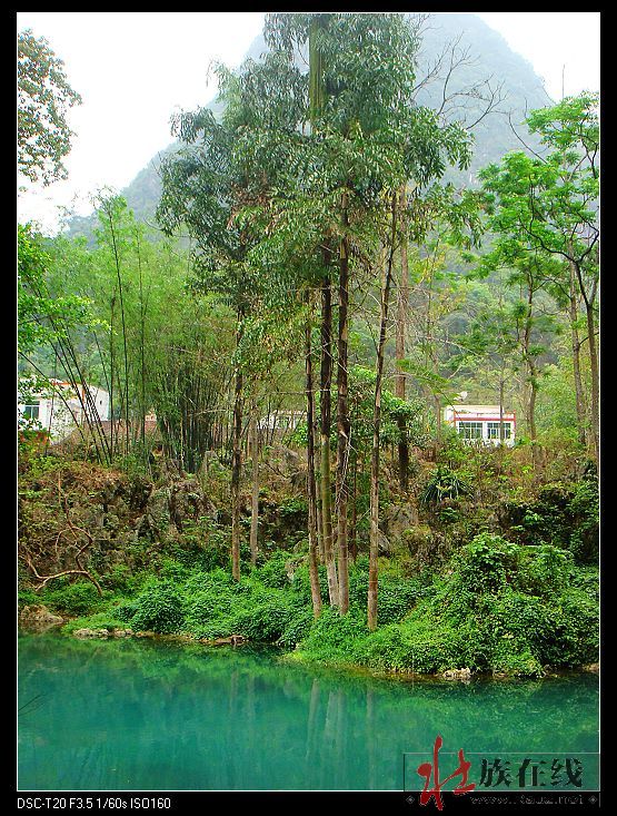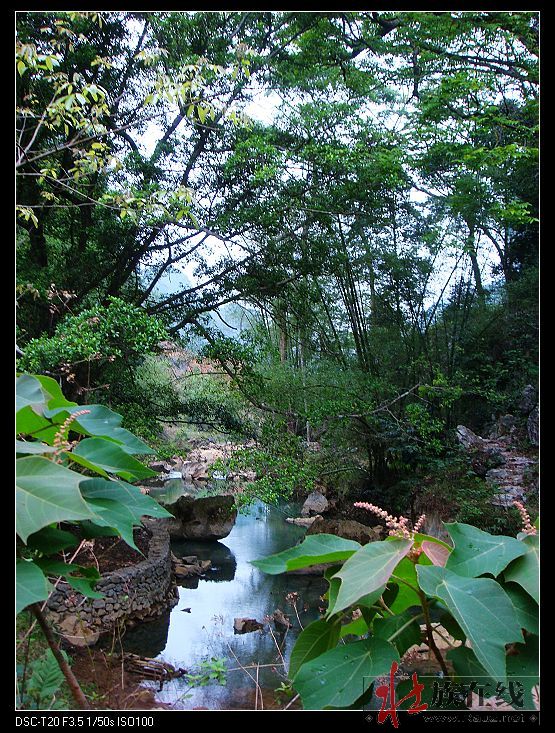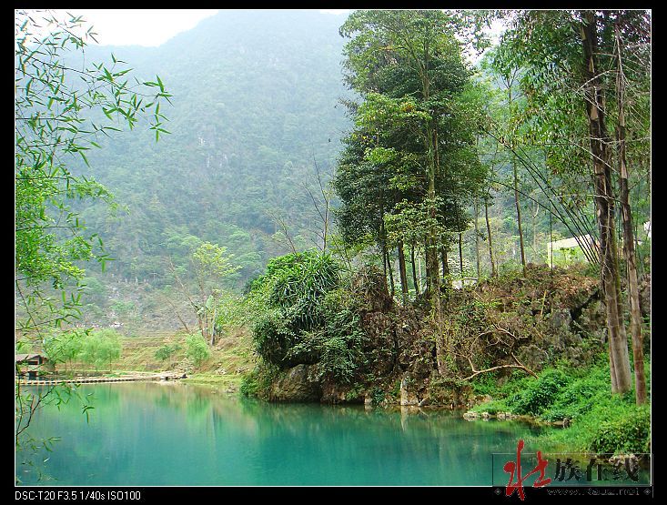 最令我和潘教授激动的是下游的原生态景致区,那里是我们在下游水坝散步后偶然发现的,距离村子这么近的河两边,居然还保留着茂密的树丛河岸,竹林、木棉树、古藤、怪石等,形成十分雅致的自然景观,特别是河岸还有两柱高耸的铁木(mayxhinj),已经是非常珍贵的树种了。河岸两边有简单的土路和石路,这种路正是我们理想当中的原生态旅游景区的样式,还有一个小坝桥,游人可以经过它到达河对岸,虽然现在还是枯水期,水位尚低,但四周的绿意盎然还是令这个河段充满着生机和春色,令人流连忘返。我们在那里游逛了很久才回到服务区吃饭,等差不多离开龙达的时候,许先生才问我们,刚才在那段河岸有没有遇到那条大蛇,我们才知道那里原来还有蛇,而且是一条十几二十公分直径粗、几米长的过山风,这种剧毒而脾气暴烈,随时给人致命危险的蛇,而且是这么的粗长,说出来挺吓人的,但许先生说那条蛇很温顺,他平时去那里散步,遇上它的话,他还会和他打招呼,然后和它byebye告别,总之不要过份靠近它就不会有危险,有点匪夷所思。想起来还有点后怕,因为潘教授在铁木旁的乱石堆上碰到一棵古藤,还在那里逗留了许久,并留影留念了,那蛇大概也是在那里盘踞的吧。有点怀疑那里虽然距离村子近却保持着这么原生态的景观和植物,是不是和那里有大蛇出没有关,德保壮人对大蛇一般都有敬畏之意,认为那不是普通的动物,而是ziox(汉字近音“聚”),多指神蛇或神龙,一般来说那种长着大树又靠近水源、并有乱石堆的地域,都是“ziox”盘踞之地,那种大树也通常叫做mayxziox(汉字近音“梅聚”),不能随意砍伐,否则遭殃,而那种地方普通人也不会靠近,特别不能在那种地方撒尿,否则据说生殖器会肿烂之类。