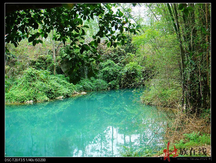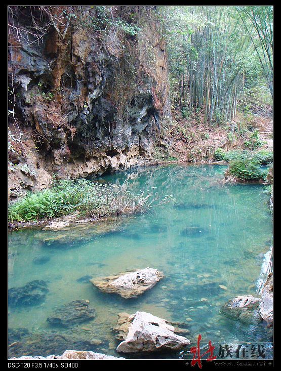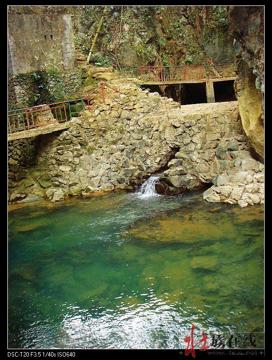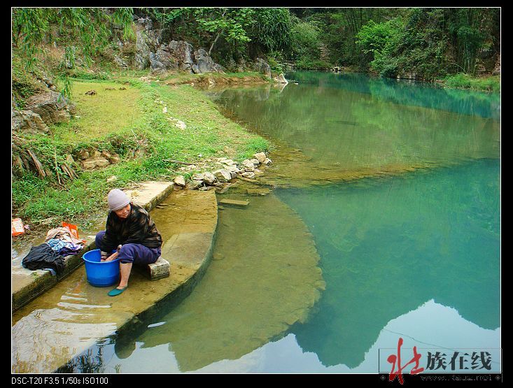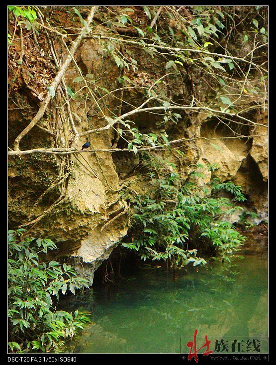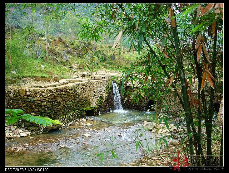 水源区是从一个宽敞的地下溶洞冒出来的大山泉(也许是一条地下河的地表出处),一年四季涌泉不断,村民们早就在该处建起一个水坝,并有一个抽水机用于灌溉,这个岩洞口四周的岩壁上,到处是古树大藤,树根沿着岩壁往水里垂,一副天然淳朴的生态景象,源头的流水处经常有一些小翠鸟和其他小鸟儿,游人进入的时候它们叽叽喳喳地飞走,等人走后它们又会飞回来停留在栏杆上、树枝上,望着水里的小鱼儿伺机猎食。