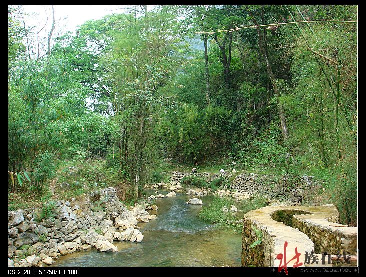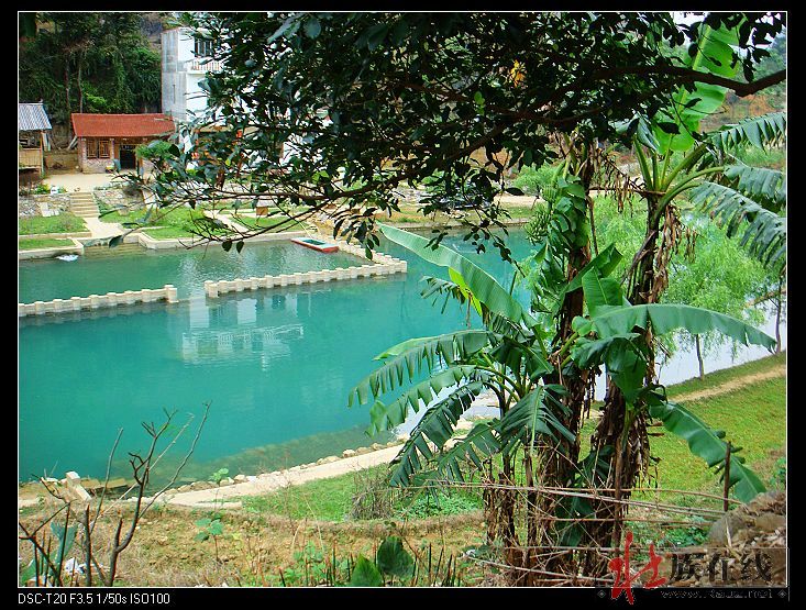 余水沿着蜿蜒崎岖的溪流,流入村子前面的服务接待区,形成一个宽敞的河道。这个宽阔的水面是许先生营建庄园的时候建起的两条水坝而蓄起的,我们已经看不到这个河段原来的景象是什么样了,但据洗衣服的一个老妪说,以前水面很低,也没有这么宽阔,就是不起眼的小河而已。话虽这么说,但看不到原始的景象也很难想象,也为这个河段带有太多的钢筋水泥味道而略显遗憾。服务接待区的河段有游泳场,有茅草亭式的餐厅,还有主人的居所。这个区域还可以做烧烤、野炊等活动。令人欣慰的是,水坝之上河里的鱼还很多,而且都是现在鉴河已经很少见到的byalingz,一群群的在水里穿梭和翻滚肚皮,有时候还在河边洗衣服或洗菜的妇女的脚下穿梭,十分可爱。