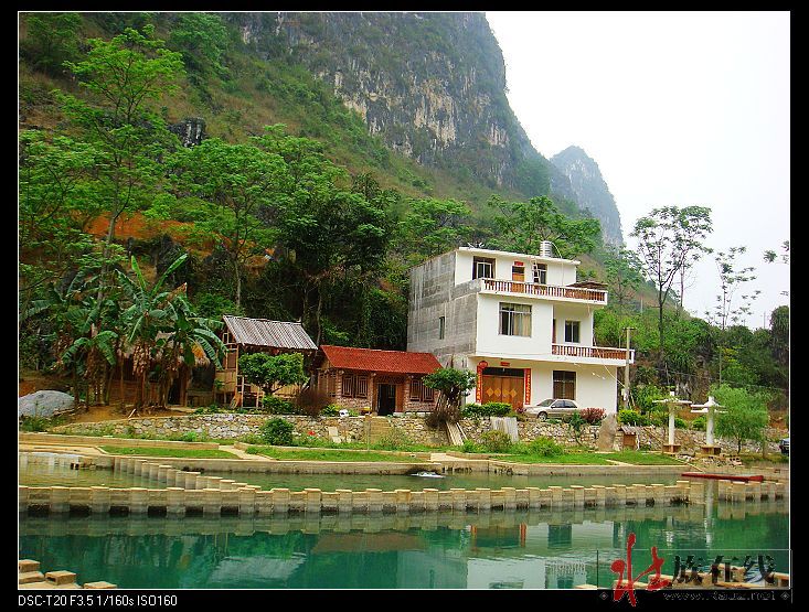 壑涧庄园位于德保县燕峒乡兴旺村陇大屯,“陇大”即壮语的“Luengh-dah”,luengh意为“石山间的平地”,也可以理解为“山谷”、“沟壑”,dah即河流,luenghdah意为“有河流的石山山谷”。经营“壑涧庄园”的许教进先生,是德保县足荣镇人,陇大屯是他外婆家所在的村子,两年前在偶然机会下他和村民们商议后决定承包村子前面的这条从地下岩洞冒出来的山泉小河,进行环境保护和旅游开发,他原先并非一个从事服务业或旅游行业的人,而是从事水泥建筑的生意人,却能够睿智地发现这条小河的美和价值,并单独投资建设起了这个对外开放的私人庄园,实在难能可贵。许先生最令我欣赏的一点,就是他保护生态的理念,以及他为保护整个村子周边自然环境而劝说村民们不要过度放牧、放弃砍柴卖柴填补生计等生产生活方式的努力,在他的努力下,全屯原有的12群山羊,现在已经减少至3群了,陇大屯的周边现在大都是郁郁葱葱的景象,应该得益于许先生的努力。