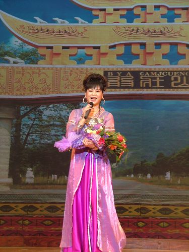 壮族的金燕子。可是,我觉得她穿着黑衣壮的服装更漂亮。她当晚演唱主题歌《敢壮山》,不过没有她即兴唱的山歌好听。