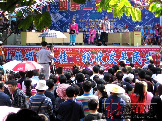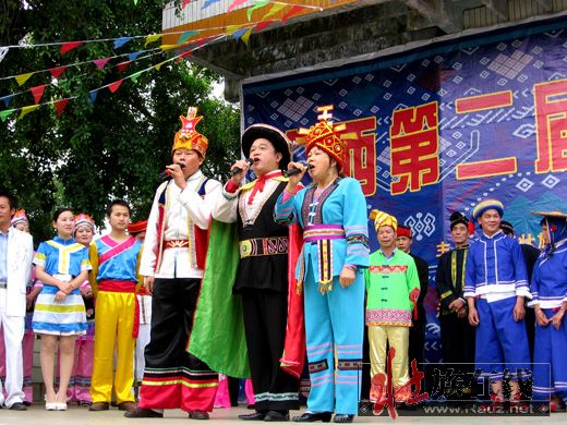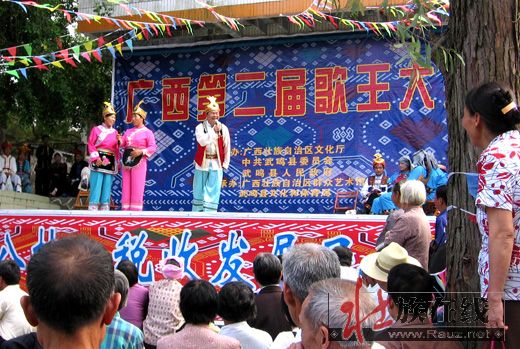 3月29日,武鸣“三月三”歌圩“广西第二届歌王大赛”在中国壮乡武鸣灵水湖畔举行,来自全区各地14个代表队的55名山歌高手参赛角逐“歌王”桂冠。其中,来自来宾、宜州、桂林、柳州的四位广西首届歌王,不仅是本届歌王大赛的擂主,大赛还特地安排他们现场演唱,实为以丰富、深情、娴熟的对歌表演给武鸣歌手现场传歌献艺,因而大受武鸣山歌爱好者的欢迎。