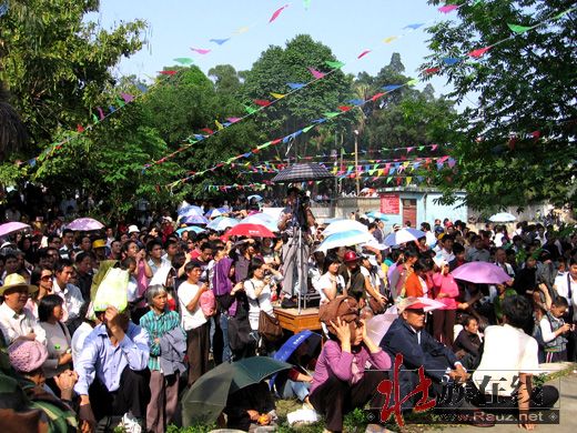 来自桂林的赵成恒歌王,这次是与妻子一起来赶歌圩唱大赛的。夫妻俩都头戴“歌王”王冠,不同的是赵成恒是广西首届歌王大赛的歌王,妻子黄流娇是桂林市的歌王,“两人是以歌为媒配成婚的。”歌场上,两人演唱幽默风趣,生活中,夫妻俩互敬互助,恩爱有加,歌场、情场、商场难分彼此。赖以维生的自家开的小饭馆,夫妻靠的是以歌招揽生意,或以歌代酒敬客人,以歌为缘会朋友,生意还算红火,夫妻俩在桂林“歌海”中算得上是有名的歌王。武鸣大赛当天,丈夫赵成恒歌王与歌王们的风趣出色演唱,不断博得观众的喝彩而无法下台,而本想到武鸣夫妻双双同台对歌的黄流娇,由于时间的关系只能与瑶王罗友军自报家门参赛自编对唱,没能获得夫妻双双同台对歌表演的机会而稍留遗憾。不过,这遗憾也许会给武鸣歌迷留下期盼再见的机会。我们衷心希望,广西更多的歌王和山歌爱好者能到武鸣传歌献技,以歌会友,相互交流,武鸣歌手也会“以歌以酒敬客人”的。
