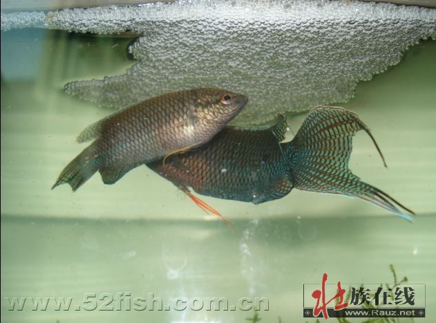 几次繁殖壮家叉,都没有进行前期的对缸,个人觉得不是很有必要。只要雄鱼在繁殖缸内发情吐好泡巢,而雌鱼也成熟抱卵,就可以将其放进繁殖缸内了。接下来便是水到渠成的事,一般情况下暴力是难免的,但多数都会在3天内成功产出不少卵。雌鱼成功产出的卵,雄鱼会不辞劳苦的整理在泡巢下,同时也开始反目成仇把雌鱼驱赶至阴冷的角落,独自担当照顾新生命的重任,在接下来的一段时间内,雄鱼是极富有攻击性的……