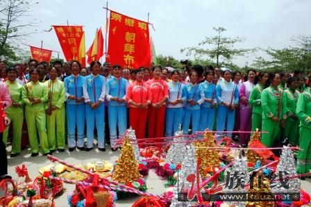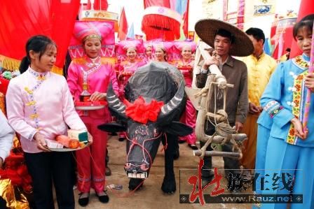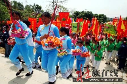祭拜队伍身着传统的壮族服饰,抬着五花八门的祭祀品。