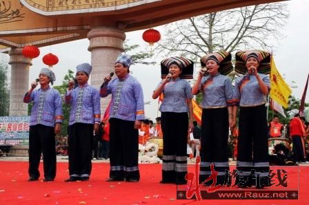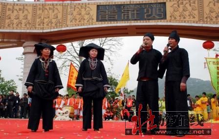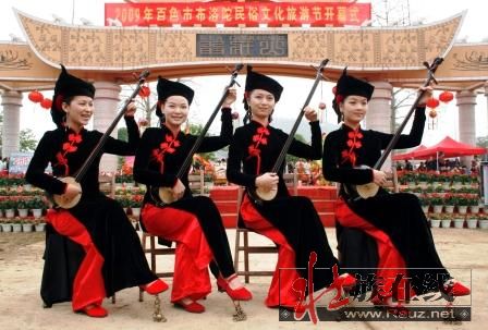 田阳艺人在在表演节目《竹咧声声唱唐皇》。唱唐皇是流传于右江沿岸一种古老的布洛陀民族曲艺,以吟唱的方式陈述布洛陀传说及其他民间故事。又是一群壮家美女哦!