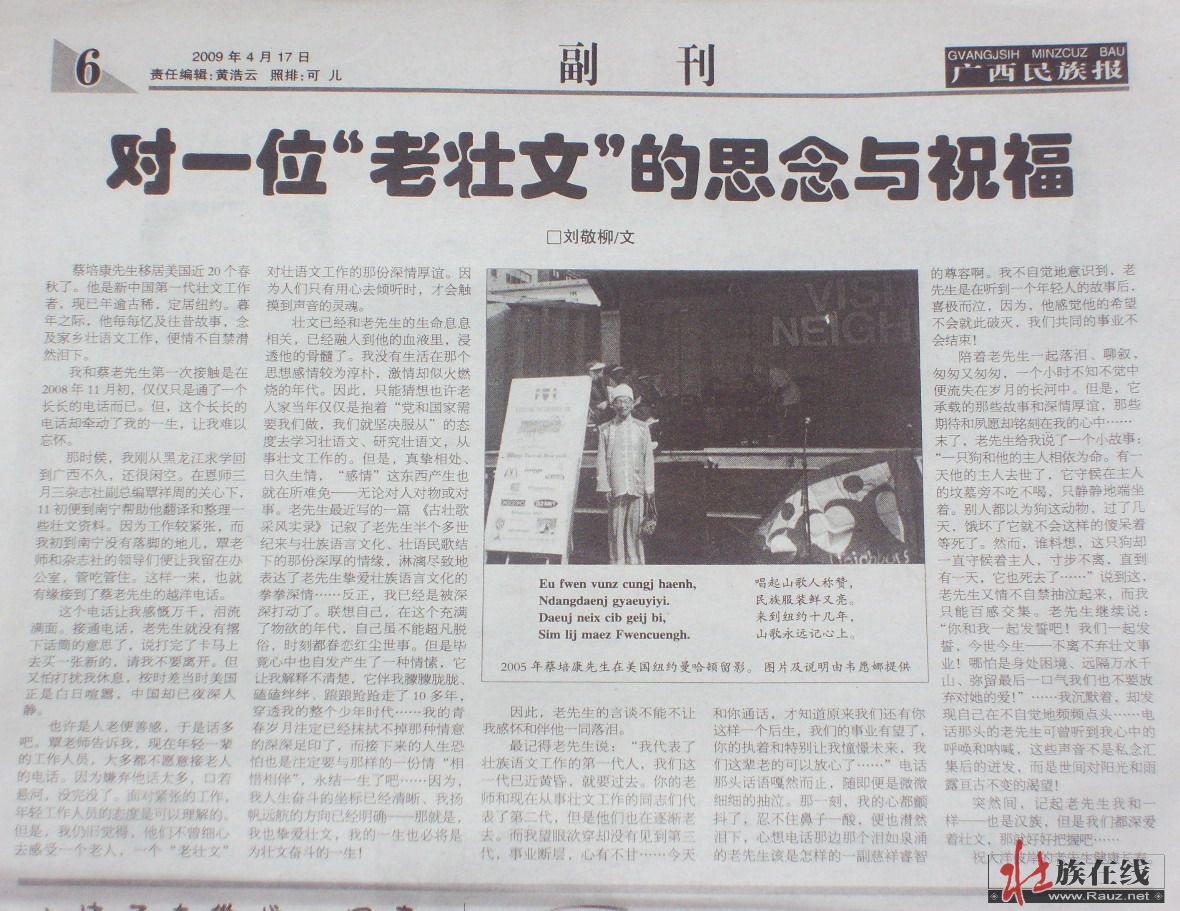 蔡培康先生移居美国近20个春秋了。他是新中国第一代壮文工作者,年逾古稀,现居纽约。暮年之际,他每每忆及往昔故事,念及家乡壮族语文工作,便情不自禁潸然泪下。