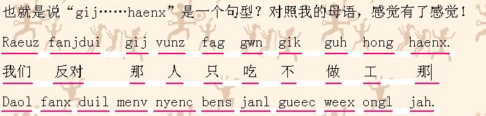 gij (名词).....haenx表示“那些(名词)...” ,与之相同的词组还有:duz....neix(这只....)例如duz mou neix、gaiq.....neix(这块.....)等,haenxz这个词在我的方言里没有,我们那的方言“那、他”都是“de”。