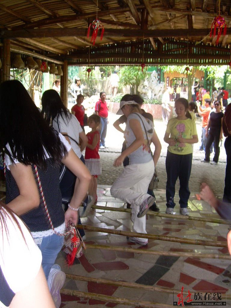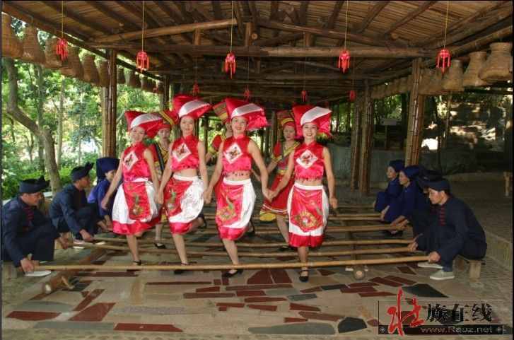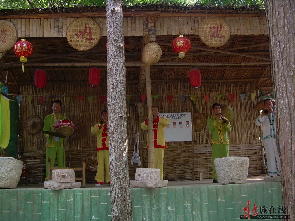 一进山寨大门就有壮民吹起唢呐,敲起锣鼓欢迎远到的客人。伴着响亮的唢呐声我们快乐前行,踏进“壮文化大观园”,真不愧是“大观园”呀。两侧排满了壮族历史悠久的生产生活用的石器和器皿,比如去米壳的工具、磨米的等工具。过了生产生活工具长廊后,就要进入跳竹杠舞了,竹杠舞大家一定要玩玩,很好玩,一定注意竹竿声音节奏,要不挨竹竿夹住脚了哈。