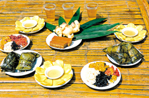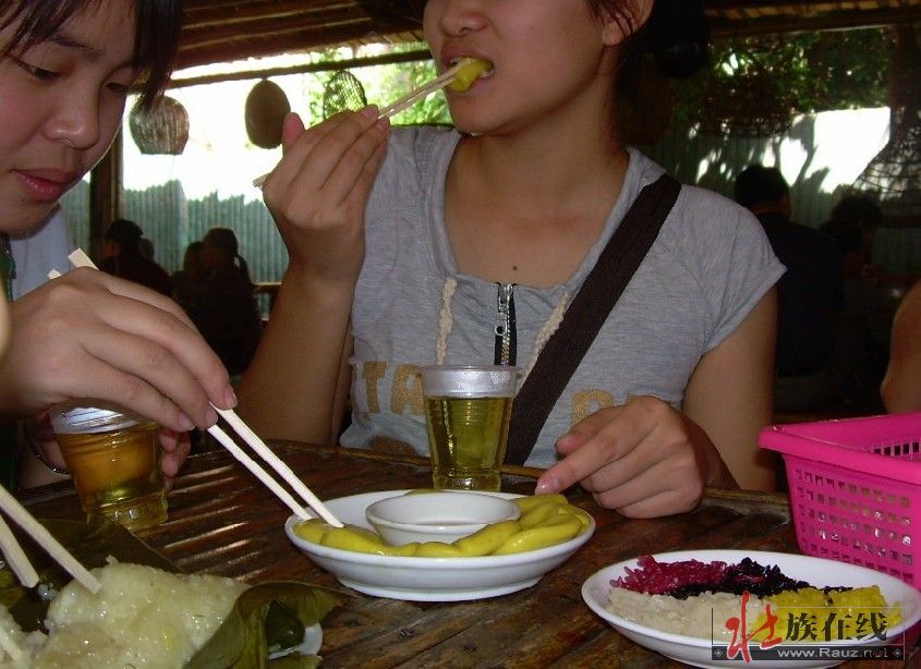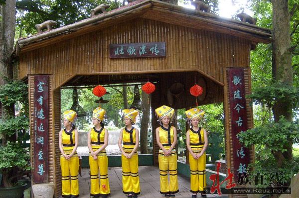 对完山歌后才能真正进入壮民居住的竹楼、石楼、土楼、生活文化景园参观,并免费可以品尝壮民家中姜茶和壮族的风味小吃,五色糯米饭。。。等这些风味小吃是免费的哈,大家可放心品尝,味道不错的哦。