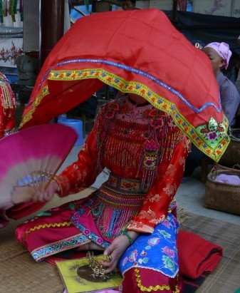3、斋曼(正月举行,几年做一次,道公主持,两少女和一妇人在坛场做糍粑、少女击榔(斋场一部份))