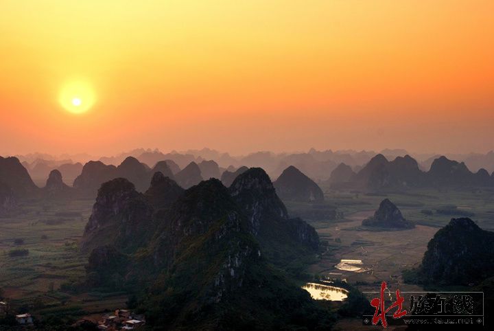 伊岭周围数十里属喀斯特地貌,秀峰林立,翠峦层叠,蜿蜒伸展,融入远天。1963年郭沫若游览武鸣时曾写下了“群峰拔地起,仿佛桂林城”