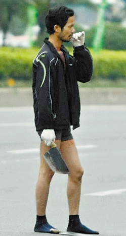 在特警包围圈的正中,站着一名身高约1.7米左右,只穿着上衣的男子,他的头发不长,脸上有一些胡子茬,脸上并不干净,显得有些污渍。他紧握着手中20余厘米长的砍刀,微微颤抖着。他的下身只穿了一条内裤。一位警员一直对着扩音器喊话,要求其放下武器。