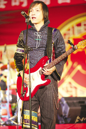 靖西绣球部落乐队坚持用壮语演绎原创流行歌曲。图为该乐队主唱陆林。