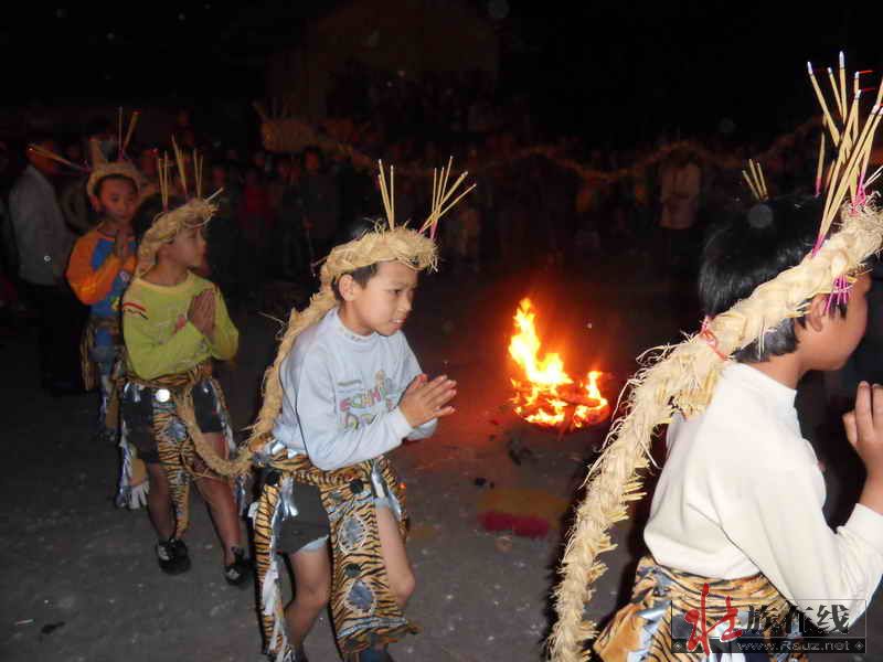 大概两个小时过去了,猫和老鼠退场了,看着他们个个满头大汗的大概很累了。几个穿着壮族衣服青年男女上场了,他们围着火堆,原来他们是要对山歌呢。虽然听不懂,但是听着他们响亮的歌喉,看着他们脸上的笑容,应该是一首幸福歌吧。对完山歌,8个小男孩蹦蹦跳跳带领着所有的演员离开了鼓场往村外走,几百米处,把小猫头插在路边,大长猫也被插在了路边,然后拜了三下。人们还陶醉在刚才的快乐之中,丝毫没有感觉舞火猫已经结束了。