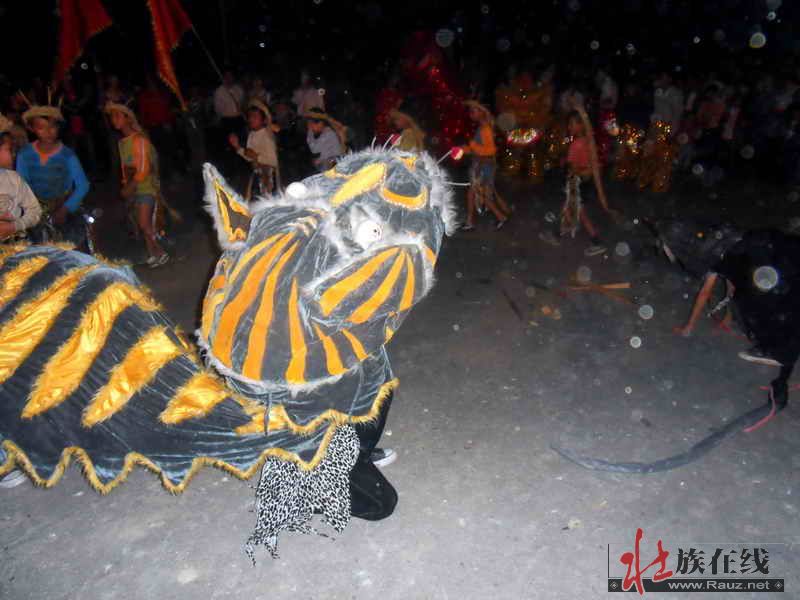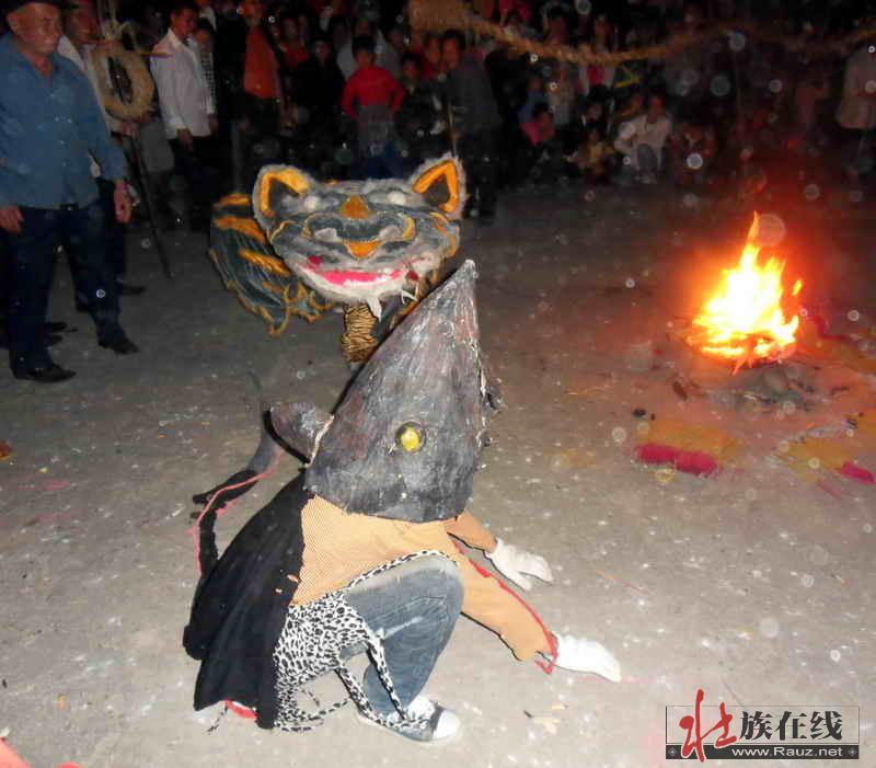 晚上七点半左右,村里8个七八岁的小男孩头上戴着用稻草做成的小猫头,猫头上还插上九拄香火(听那里的老人说点香火是代表祈福的意思),还有一个由10个大男人用木棍举着也是用稻草做成的大长猫,猫头由另一人举着,大长猫身上也点着密密麻麻的无数根香火,还有一个小男孩戴着一个用纸糊成的非常漂亮的大猫头,最最可爱的就是那两只黑色的小老鼠了,也是用纸糊成,由两个小男孩分别戴着,让人看了很想抱回家的感觉。一切准备好了之后,排成长队,最前面是两条火红的大狮子,跟着的是鼓手们,之后是几个穿着壮服的帅小伙和壮族姑娘,后面就是猫和老鼠的队伍了,由几百个村民护送到村外的晒谷场,人们期待已久的激心动魄的舞火猫节目正式开始。