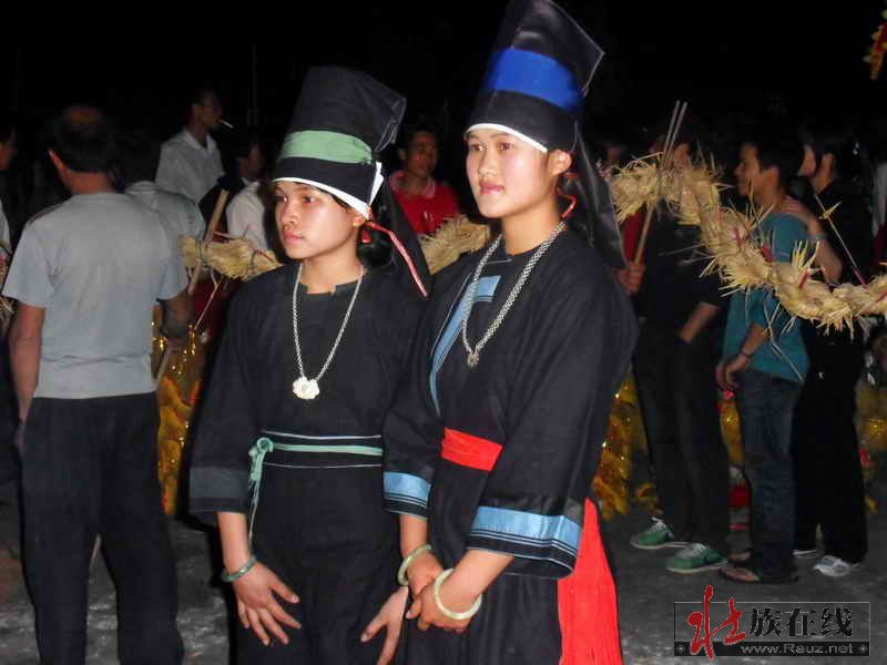 南乡的壮族在举行舞火猫活动时妇女们身着一种独具特色的传统服饰——高顶头饰,这种头饰用竹壳等有韧性的东西做成内托,以白布裹之再包黑布,最后緾以红布条或绣花带,高耸巍峨,它是已婚妇女的标志,也是庆典的礼服。衣服以自织的经靛染的土布制作,多为紫黑色的无领大襟衣,袖宽盈尺,衣长至膝,领襟、袖口有数道宽窄不同的浅蓝色布条镶边,用大红色或蓝色的长布条束腰,俗称“反膊衫”。下穿黑色宽筒长裤,俗称“牛头裤”,脚穿勾头鞋。全服无绣花装饰亦少银饰,更显古朴幽深。南乡壮族传统服饰上刺绣遗存极少,但很精致,针法精细严密。如清未民初的勒额(即高顶头饰上的饰带),运用多种绣法,少量素色,却生动地表现出牡丹、梅花盛开,蝴蝶翩翩起舞的春天景象。传统背带用壮锦或刺绣装饰,多绣八卦乾坤纹和太阳纹等吉祥图案。但自上世纪70年代后,自织土布几乎已经绝迹,机绣已代替传统手工绣花法,传统民族服装除极个别的老年妇女外已无人再穿,衣着发式已与周围的汉族相类。