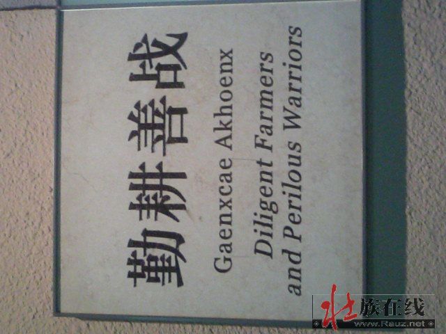 前两天(1-26,1-27)上南宁逛完人才市场后到附近的壮族自治区博物馆看了下,在二楼看到不少精品,其中看到介绍瓯骆部落时用了一个词“gaenx cae akhoenx 勤耕善战”