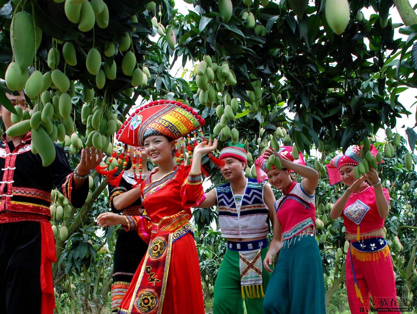 据传,唐朝时芒果从印度引入中国,辗转播种于风景优美、气候适宜、土壤肥沃的右江河谷腹地——田东。一千多年来,枝繁叶茂的芒果荫蔽右江河谷,以其浓香的乳汁哺育着一代又一代灵秀聪慧的壮族儿女。得芒果之助壮家人繁衍鼎盛,尊为圣果。芒果飘香时节,各村寨大摆芒果宴席,席设三道:一道敬奉天地,感谢上苍;二道敬奉布洛陀,感谢先祖;三道敬献贵宾,共享丰收喜悦、、、、、、漫山遍野的芒果将土酒荷茶之风味、嘹歌壮舞之风情、青年男女之恋情融汇成欢乐的海洋!