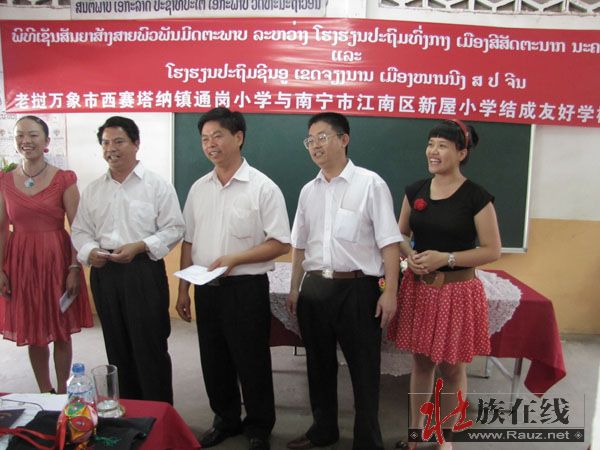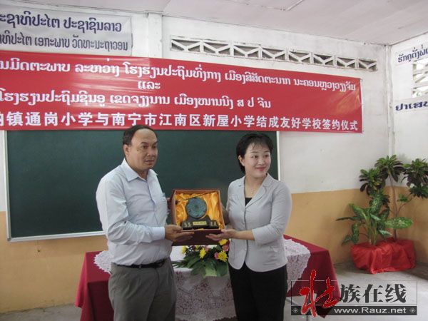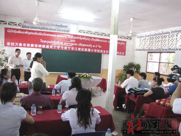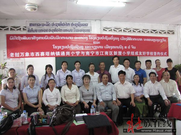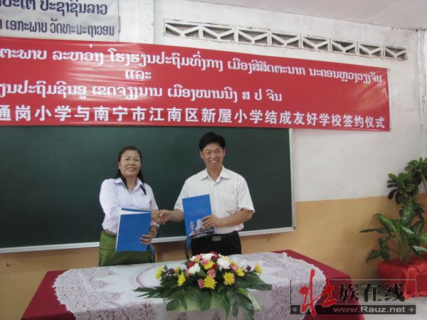 经老挝外交部和教育部批准,老挝万象市西塞塔纳镇通岗小学和中国广西南宁市江南区新屋小学结成友好学校。这一天,就要在西塞塔纳镇通岗小学举行隆重的签约仪式。通岗小学的校门口,悬挂着老汉两种文字对照的欢迎标语——“热烈欢迎中国广西南宁市江南区教育代表团到我校考察交流”。在该校的一间教室里,悬挂着老汉两种文字对照的横额——“老挝万象市西塞塔纳镇通岗小学与南宁市江南区新屋小学结成友好学校签约仪式”,红底白字,格外醒目。老挝教育部康完主任和万象市教育厅的领导、通岗小学部分教师、学生家长和南宁市江南区教育代表团的成员近30人出席了签约仪式。