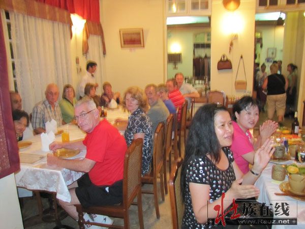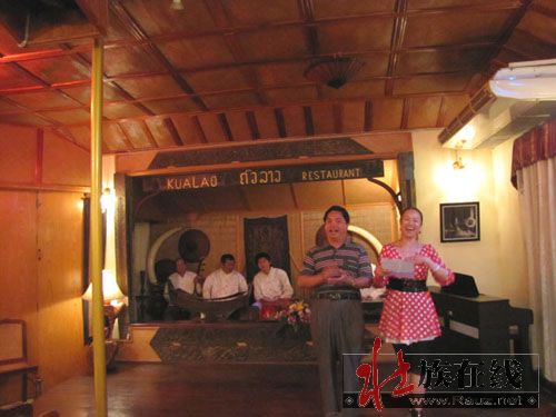 代表团在老挝饭店给老挝和来自欧美的客人演唱壮族山歌《中国老挝心连心》,博得众客人的喝彩