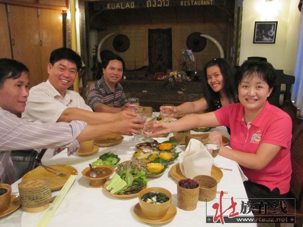 此外,代表团还到万象市的凯旋门、总理府广场、塔峦和琅勃拉邦的普西山、湄公河畔的乡村等地进行参观考察,向老挝人民传播我们的壮乡文化。在万象市老挝饭店的舞台上,代表团成员与老挝艺术家同台歌舞,给老挝本土和来自欧美的客人唱起了壮族山歌《中国老挝心连心》,深受到人们的喜爱和好评,老挝的艺术家们也给代表团献上他们独具特色的老挝歌舞,气氛非常融洽。