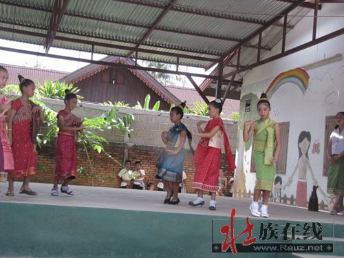 签约仪式结束后,通岗小学全体师生和校外来宾集中在大操场,观看该校小学生的文艺表演。动听的老挝歌曲和小学生优美的舞姿,深深地吸引了在场的观众。老挝教育部康完女士、万象市教育厅康波副厅长、通岗小学部分师生与来访的宾朋一起上台跳起了老挝舞蹈,让友谊和亲情在这动人的旋律和优美的舞姿中传递着,整个活动在暖融融的友谊氛围中结束了。值得一提的是,代表团带去的铜鼓、绣球、壮锦袋、壮语、山歌和壮文书报等带有壮乡文化元素的东西在这次活动中得到了充分的展示,引起老挝朋友的关注。一位女教师动情地说:“听说广西的壮族文化特色很浓厚,壮语和我们老挝语的词汇中有不少是相同的,太有趣了,以后我一定要到广西去走一走!”。万象市教育厅副厅长康波先生第一次见到壮文报刊,很感兴趣,他问道:“这个东西能送给我吗?”代表团的同志说:“当然可以,以后出版新的,还给您寄过来呢。”康波先生高兴地笑着说:“那就太好了”。