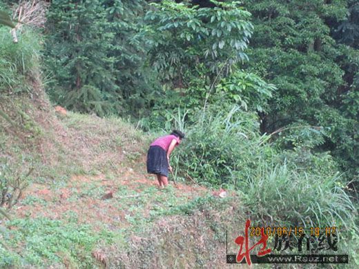壮年男子外出打工,妇女扛起家中的活路,这位妇女傍晚还在外面做工。