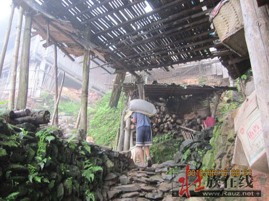 31 由于摩托车只能开到寨底,所以运往寨顶用以修建防火水池的水泥只能靠人工扛。次日清晨,红瑶寨子被迷雾笼罩着。