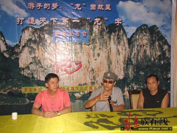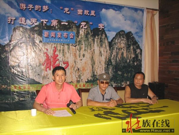 新闻发布会现场,主办单位南宁奔腾文化董事长唐铭(左一)绍第一“龙”字的文化和故事,后面的背景是以后“龙”的效果图。中为林静纯,右为阳光辉。