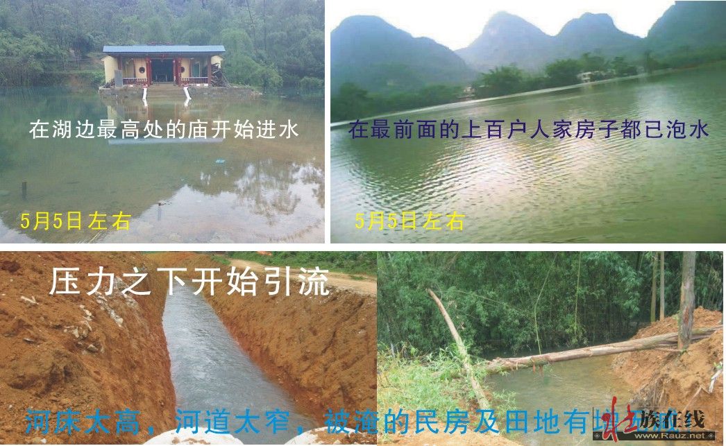 广西百色市靖西县新甲乡庞凌村,2010年3月,正处全国各地出现严重旱灾时,该村里及周边附近湖水却不同寻常的涨水,而且涨水速度很快,起初一天涨1米多高,流传出的消息有多种,有说是因为地震引起的,有说是因为附近铝厂要开路炸石头误炸到地下水通道上面倒至的,真正原因至今为止我们仍不得而知,但这对村民来说已不重要,他们担心的是被大水淹了几个月的家和田地……