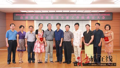 本报讯(记者 黄新荣)   713日上午,自治区民语委壮文专家工作组在南宁正式成立,第一批受聘的专家有广西民族大学壮侗语研究所所长蒙元耀、广西民族大学教授韦树关、广西师范学院教授黄桂秋、广西大学教授覃凤余、中央民族语文翻译局壮文室译审关仕京等11位我区民族语文专家学者,由蒙元耀任组长、关仕京、零兴宁任副组长。在当天的成立大会上,自治区民语委主任卢献匾为专家们颁发聘书并做了重要讲话。自治区民语委副主任陆振宇主持会议,巡视员覃耀武出席大会。受聘专家学者、民语委机关干部职工、直属单位和代管单位班子成员共40人参加了会议。