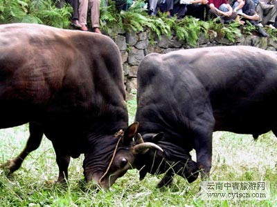 中午13时,惊心动魄的斗牛拉开了 “ 战幕 ” ,刹那间,斗牛场上灰尘滚滚,破土飞扬,一对对角斗的牛打得难解难分,时进时退,时倒时爬,两角相击、相撞、相勾,发出 “ 啪啪 ” 响声,这紧张激烈的场面,使观者发出阵阵喝彩声。有的牛斗红了眼,斗断了角,浑身是血,仍不甘败下风。经过精彩激烈的 “ 战斗 ” ,败者夺路而逃,胜者乘胜追击。在败者无精打彩地奔跑时,胜者高昂着头大声呼叫,洋洋得意。