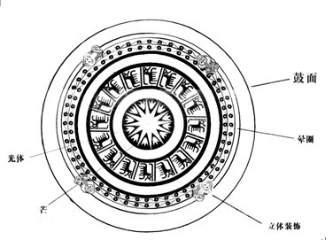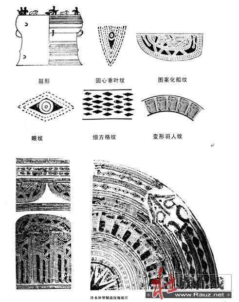 翎眼纹多装饰在太阳纹的芒间。菱纹、眼纹则鼓面、鼓身都有。