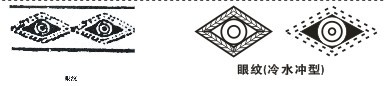 菱纹、眼纹、翎眼纹是指一些眼状的菱形纹和孔雀翎上的眼形纹等纹饰。这种纹,在冷水冲型、北流型、西盟型、麻江型铜鼓上都有。