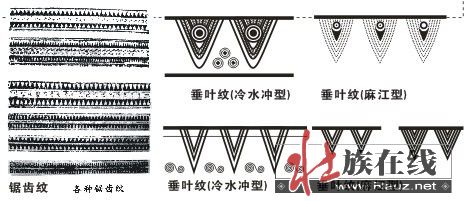垂叶纹与锯齿纹相似,只是比锯齿纹大。多出现在冷水冲型铜鼓。