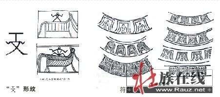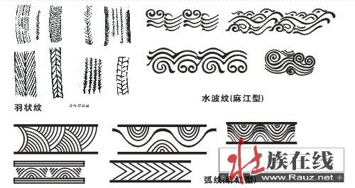 羽状纹也叫叶脉纹,是在一条中轴线的两侧又伸出一串斜线,有的较粗短,有的较细长,是一种模拟鸟羽或叶脉的纹饰。它仅见于冷水冲型铜鼓,鼓面、鼓身都有,是一种填充、烘托性纹饰。