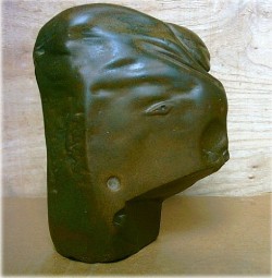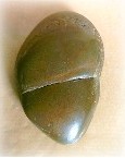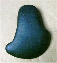 新石器时代右江文化,人头形石刀,器呈半月形,灰黄色,长7.5厘米,宽5.5厘米,厚1.3厘米。